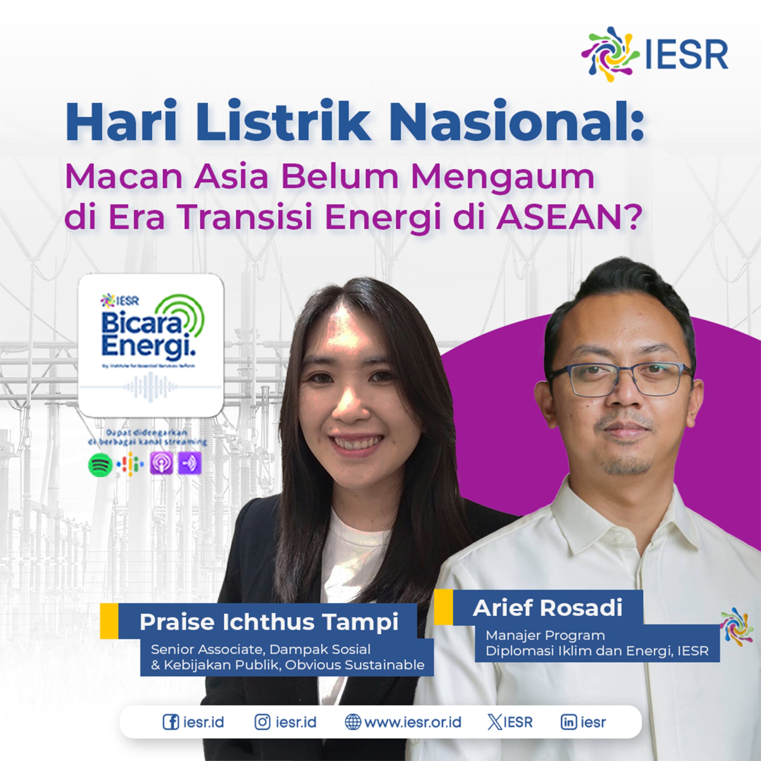 Setiap 27 Oktober, Indonesia memperingati Hari ListrikNasional yang menjadi pengingat betapa pentingnya pentingnya listrik dalampembangunan dan kesejahteraan masyarakat. Podcast IESR Bicara energi kali ini membahas posisi Indonesia dalam mempercepat transisi energi yang memanfaatkan listrik yang ramah lingkungan, berjudul “Macan Asia Belum Mengaum di Era Transisi Energi di ASEAN?”. Podcast IESR Bicara Energi ini dipandu oleh Immakulata Soraya, Staf Komunikasi Proyek CASE, dengan narasumber Praise Ichthus Tampi, Senior Associate – Dampak Sosial & Kebijakan Publik, Obvious Sustainable dan Arief Rosadi, Manajer Diplomasi Iklim dan Energi, IESR.